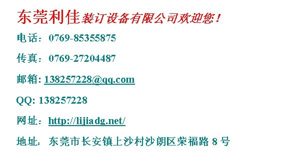服務(wù)宗旨:       東莞市利佳裝訂設(shè)備有限公司成立于2004年,公司座落于中國五金機(jī)械模具制造名鎮(zhèn) ——東莞市長安鎮(zhèn)。東莞利佳是一家專業(yè)研發(fā)﹑制造﹑銷售印刷后道加工設(shè)備的企業(yè), 經(jīng)過幾年的發(fā)展,公司成功地研發(fā)出精裝類書籍﹑筆記本制作的全套機(jī)械設(shè)備,如:撞 背機(jī),捆書機(jī),扒圓機(jī),起脊機(jī),壓平機(jī),切角機(jī),上膠機(jī)等;同時(shí)也配套銷售相關(guān) 的印后裝訂設(shè)備及零件耗材;        成立至今,公司始終堅(jiān)持“品質(zhì)服務(wù),力(利)求最佳——利佳”的經(jīng)營理念,力求   為客戶帶來最佳的品質(zhì)和服務(wù)。公司研發(fā)出來的半自動書芯扒圓機(jī),半自動書芯起脊   機(jī),油壓雙角切圓機(jī)等產(chǎn)品均為國內(nèi)首創(chuàng),在同類產(chǎn)品中性價(jià)比為最佳;同時(shí)公司可   根據(jù)客戶實(shí)際需求訂做各種設(shè)備,曾成功的為深圳凸版,東莞金杯,圓洲勤達(dá),南沙恒   美等印刷廠家制造了相關(guān)配套設(shè)備;       利佳公司將繼續(xù)以客戶利益為導(dǎo)向,以最佳的品質(zhì)和服務(wù)為贏得客戶的信賴而努力!       品質(zhì)服務(wù),力求最佳——利佳!   公司主營: 1 研發(fā)銷售精裝書籍全套設(shè)備,如:圓脊機(jī)、上殼機(jī)、壓槽機(jī),壓平機(jī),撞脊機(jī),扎 書機(jī),開板紙機(jī),中心條機(jī)等;